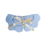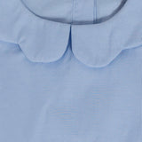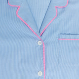 • En las tallas 2 a 6, el cuello es redondo en forma de flor con dos bolsitas en el frente. La piola de las bolsas, puños y tobillos es de color rosa para contrastar con la tela azul, a rayas, aunque casi imperceptible.